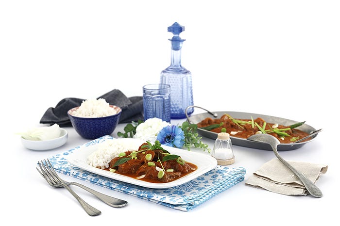 Este curry también se puede hacer con cuello de cordero, pero en ese caso, tendrías que cocinar el cordero con sus huesos y asegurarte de que no esté cortado a machete. Estoy segura de que sale buenísimo, pero ten en cuenta que será un plato de esos de comer casi con las manos para chupar los huesos. Ni tan mal.