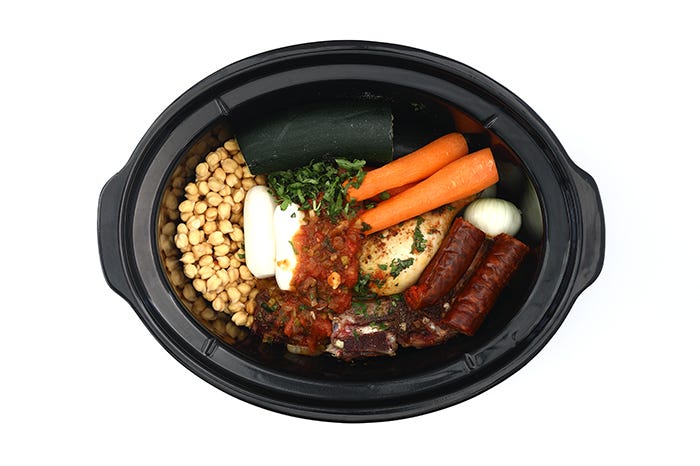 Antes de servir, devuelve las carnes y el calabacín al slow cooker y deja que se calienten en el caldo mientras preparas la sémola de trigo. Prueba y rectifica el punto de sal.