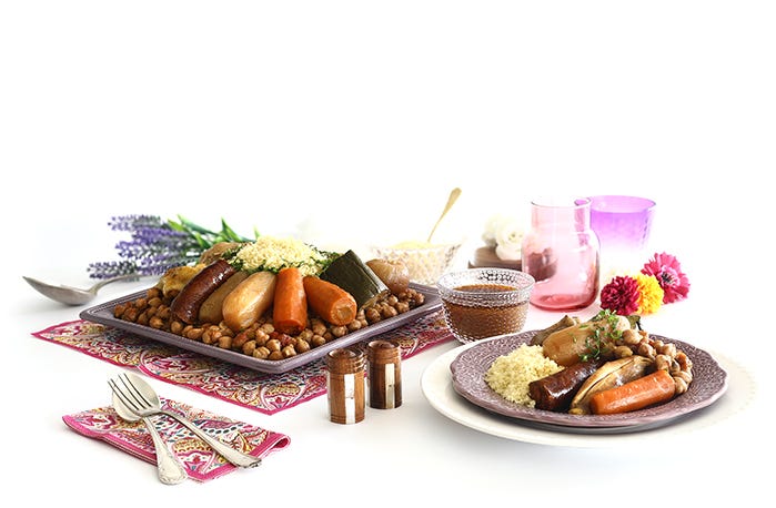 Pon la sémola de cuscús en el centro de una bandeja. Coloca alrededor los garbanzos, las carnes y las hortalizas. Riégalas con algo de caldo de cocción y pon una salsera con el caldo restante para que cada comensal pueda añadirlo a su gusto en el plato.