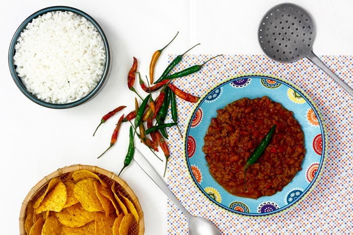 Chili sin carne. No tiene nada que envidiar a la versión clásica: este chili sin carne es un plato completo, de los que gusta compartir en buena compañía. Verduras, legumbre y soja texturizada bien cocinadas y aliñadas.