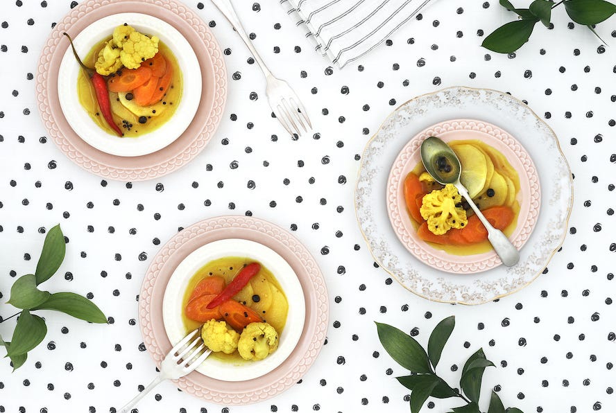 También las comidas fresquitas, fáciles y casi instantáneas, que los días de mucho calor apetece menos meterse en fregaos en la cocina. Este encurtido picante de nabo, zanahoria y coliflor es una de esas elaboraciones que se preparan en un pispás en el slow cooker, se meten en un tarro, se guardan en el frigo y nos salvan la vida a la hora de comer un día de verano cualquiera.