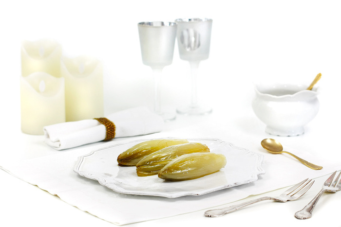 Las endivias confitadas también se pueden acompañar de una vinagreta cítrica, de un pesto rojo de tomates secos y otras salsas vegetales para incluirlo en un menú vegano. Yo las he cocinado y fotografiado a pelo, sin añadir ningún complemento para que cada cual las vista como más le guste. A la hora de escogerlas para un menú, hay que tener en cuenta que su sabor es amargo y acusado, y puede que no sea del gusto de todos.