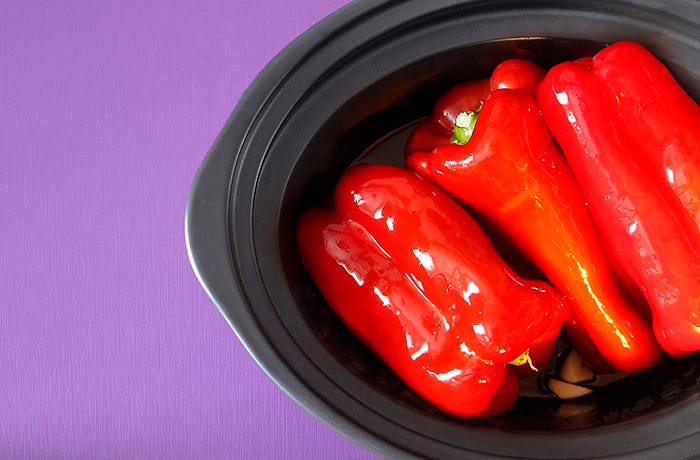 Limpia los pimientos, sécalos, pincélalos con aceite de oliva y colócalos en la olla de cocción lenta.
