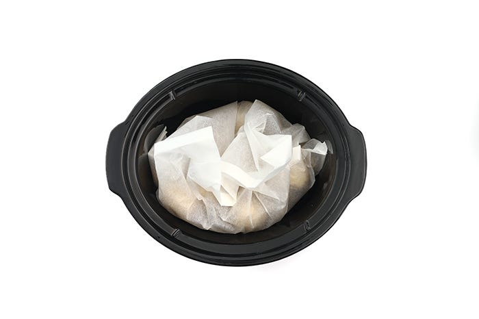 Deja que las patatas se templen dentro del slow cooker sin abrir el papillote.