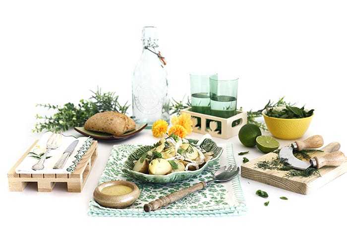 Las ensaladas de patata son, para mí, las más suculentas que se pueden servir en verano. Resultan frescas, nutritivas y saciantes, y combinan con muchos ingredientes distintos. Esta ensalada de patatas y hierbas tiene dos claves que se pueden aplicar como punto de partida para hacer otras muchas ensaladas de patata: la cocción en papillote y el uso de patatas pequeñas de guarnición.