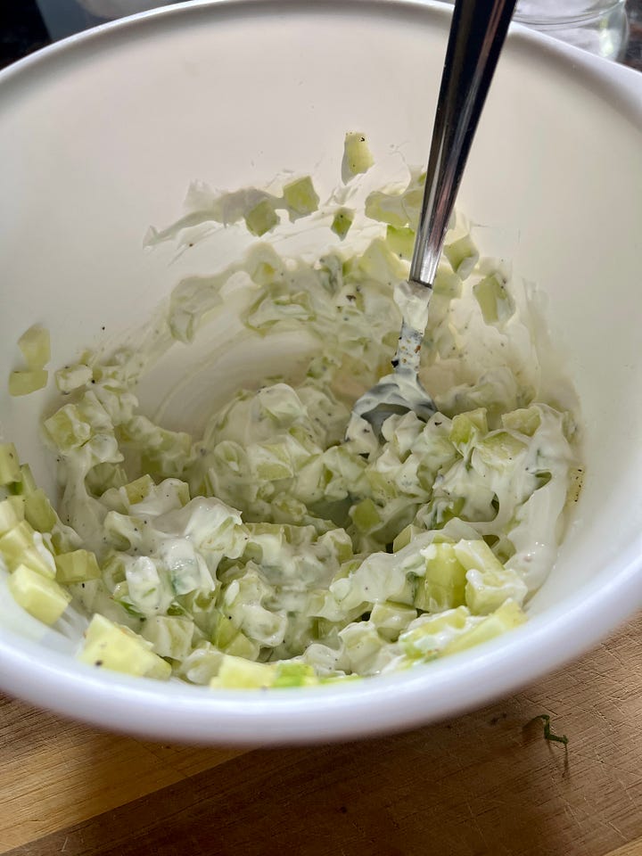 Las patatas son glotonas y tienen una neutralidad que hace que casen con muchos ingredientes. En esta receta las mezclamos con pepino, yogur, menta y un puntito de mostaza, dejando el asunto de la proteína a cargo de unas migas de bacalao desalado crudo.