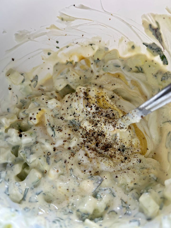 Una ensalada que combina patatas nuevas cocidas, con bacalao desalado crudo. Bañada con una salsa inspirada en el tzatziki.