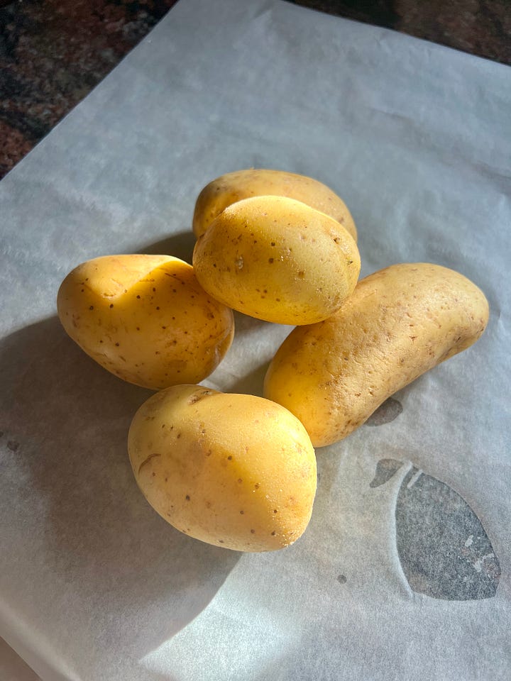Las que mejor resultado me dan para las ensaladas son las patatas nuevas. Limpias y enteras, sin pelar. Cocinadas en el slow cooker en una lámina de papel de horno para evitar que se quemen y se peguen al recipiente. No hay más secreto ni complicación.
