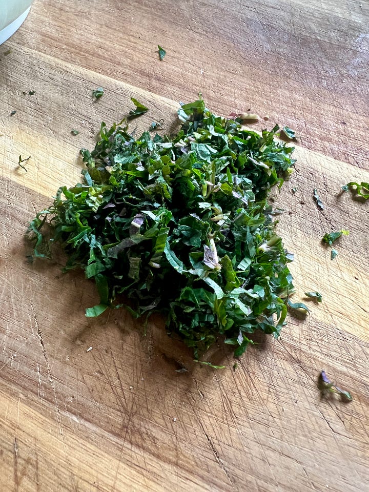 Mezcla en un bol el yogur, dos cucharadas de menta picada, 1 cucharada de cebollino picado, el zumo de medio limón, la mostaza, pimienta negra y sal.