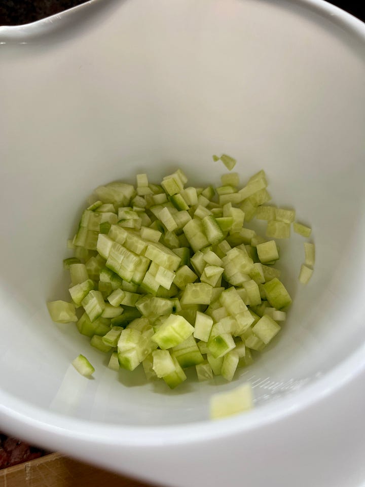 Elimina la piel del pepino y córtalo en dados pequeños.