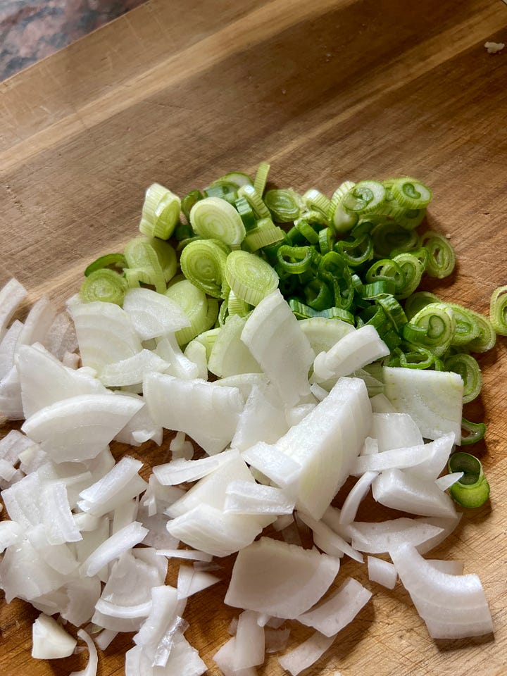 Pica la cebolla en dados pequeños y el tallo verde en rodajas finas.