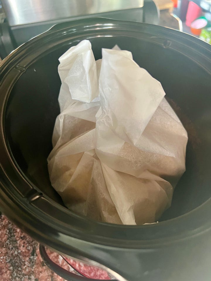 Lava las patatas, sécalas y ponlas sobre una lámina de papel de horno. Haz dobleces en los lados para cerrarla un poco y pon el paquete en el slow cooker.