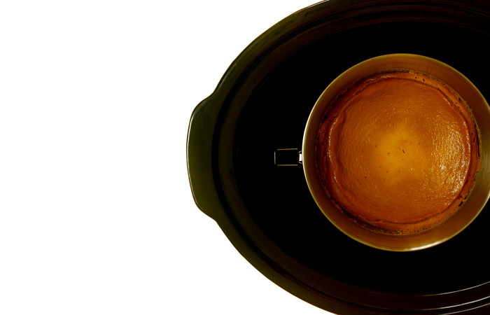 Pon agua en el fondo del slow cooker. El agua deberá cubrir dos dedos la parte inferior del molde.