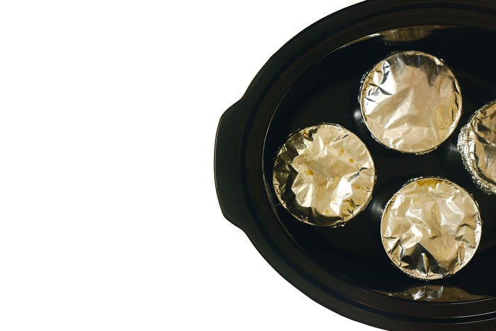Cubre los moldes de flan con papel de cocina metálico y colócalos en la olla. Cuece los flanes a olla tapada durante aproximadamente dos horas en ALTA.