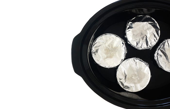 Pon los moldes en el slow cooker y vierte agua en el fondo del recipiente de la crock pot hasta cubrir dos dedos aproximadamente.