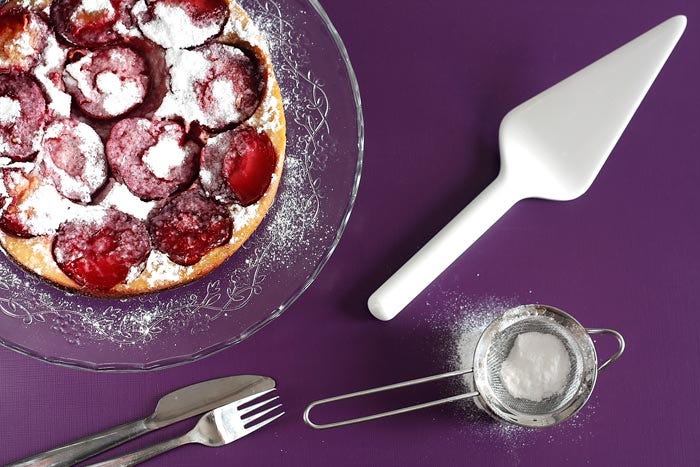 Las ciruelas se cocinan hasta convertirse en una delicia suave y dulce que asoma con un color reventón entre el azúcar en polvo que cubre la flognarde. Te chuparás los dedos y te sabrá a poco, así que, compra más ciruelas, que seguro repites.