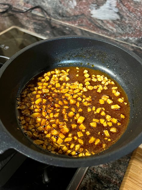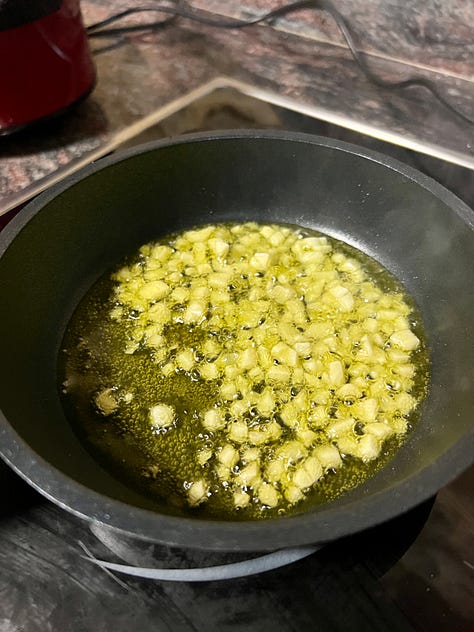 Pon 4 cucharadas de aceite de oliva en una sartén y cocina los ajos hasta que empiecen a bailar en el aceite sin dejar que se doren.