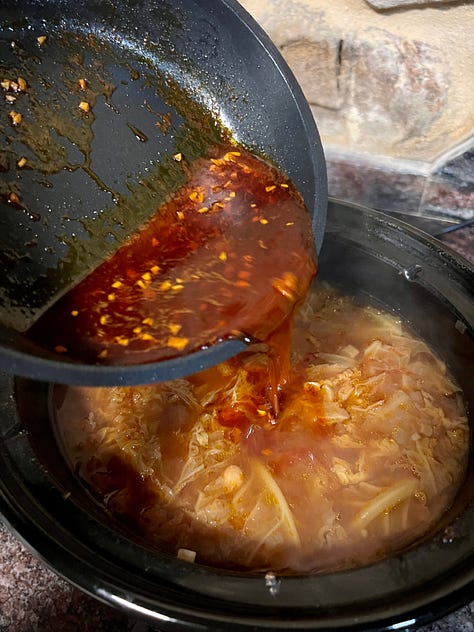 En la primera prueba de este plato cometí un error: puse el repollo desde el principio de la cocción, de manera que terminó desintegrado. No sé cómo no me di cuenta; yo, la señora a la que le gusta la col apenas blanqueada.