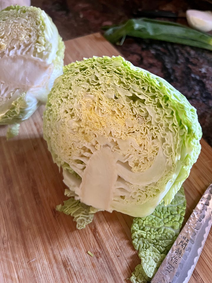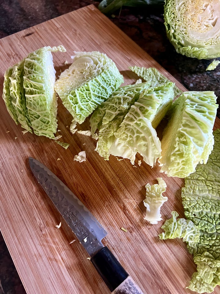 Corta el repollo en láminas gruesas de 3 cm. Añádelas cuando falte aproximadamente 1 hora de cocción.