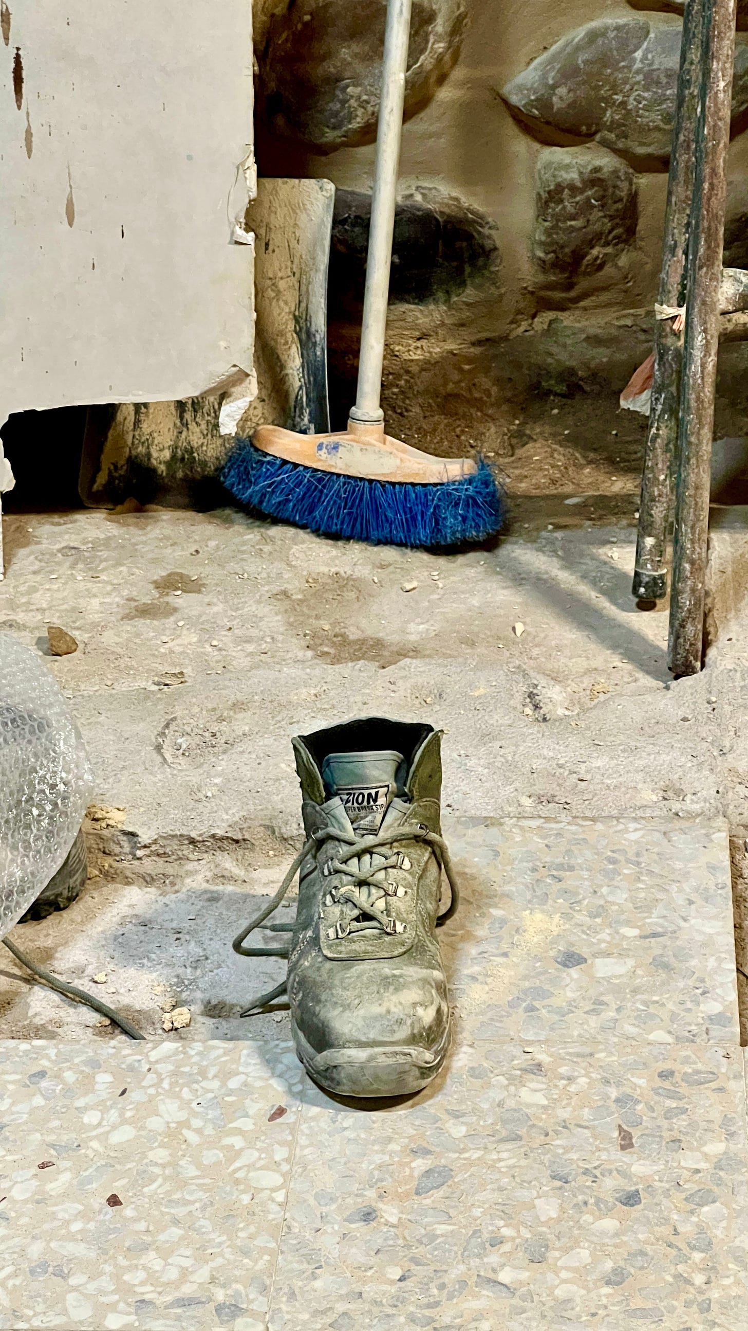 Dejé los garbanzos en remojo por la noche y, al levantarme, puse el guiso en marcha. Mientras se hacía, tuve tiempo de hacer cemento, tapar grietas y cortar placas de porexpan para reparar la leñera.