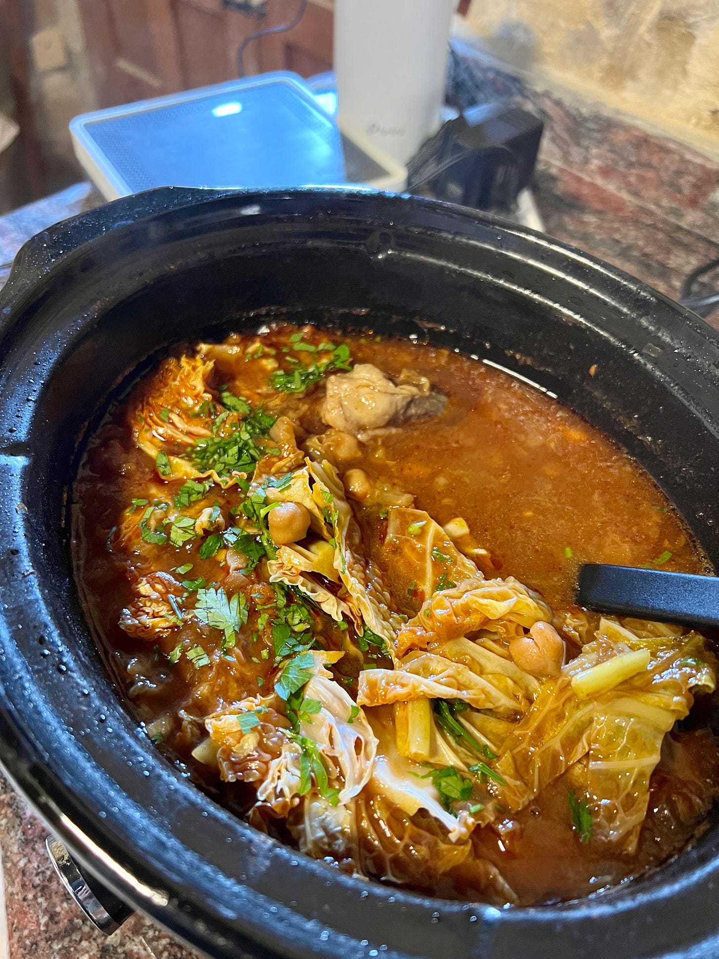 Cociné este estofado de garbanzos, repollo y carrilleras en un sábado regulero de esos en los que las circunstancias no te acompañan y te encuentras bastante pocha. La cocina llevaba casi cuatro semanas en obras –dos más de las pactadas–, cocinar se hacía complicado y necesitaba producir más recetas.