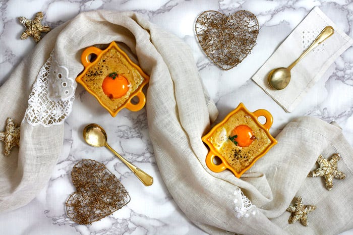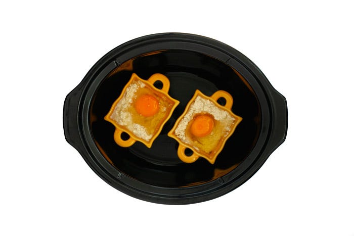 Los huevos en cocotte tienen su versión navideña cocinados con una suave crema de foie gras. Es una receta tan fácil de hacer como cascar un huevo o mezclar crema fraîche con un bloc de foie gras. El secreto de esta receta es controlar el tiempo para que el huevo no se cuaje en exceso y precalentar el slow cooker para que las cocottes entren en un ambiente caliente y la cocción no se eternice (algo que ayudará a poder tener ese control).