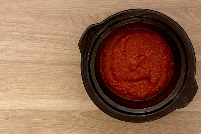 Coloca el tomate, el tomate concentrado, la cebolla y el ajo en la olla y cocina durante 4 horas en ALTA.