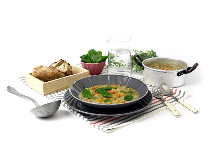 Sirve muy caliente con las hojas de espinaca o acelga baby crudas recién mezcladas.
