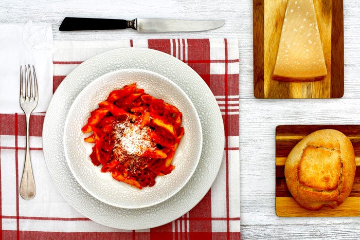 Después de varias pruebas, llegué a la fórmula que me convenció. Sé que puede chocar la cantidad de tomate utilizada –tres hermosas latas de pulpa o triturado– pero es necesaria para conseguir que la pasta se cocine en la salsa, absorbiendo sus jugos y obteniendo una crema de tomate que la acaricie.