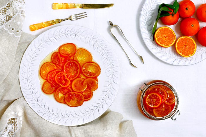 Hay equivocaciones que te traen consecuencias muy dulces, como estas mandarinas confitadas y la mermelada de mandarina que también me marqué en un periquete. Bendita precipitación. Si las naranjas confitadas son la bomba, las mandarinas se llevan el Oscar, el Tony y el Grammy latino de las frutas confitadas. Su aroma, mucho más delicado que el de las naranjas, y su pequeño tamaño, que permite hacer unas rodajas pequeñas, hacen que resulten una delicia servidas con cremas dulces, yogur, queso fresco o embebidas en bizcochos.