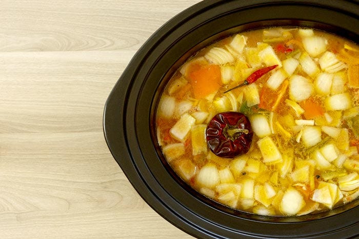 Si ves que hay demasiado líquido, aparta una parte de caldo en un cazo, ponlo al fuego fuerte y deja que reduzca a la mitad. Incorpora el caldo reducido a la olla lenta y mezcla.