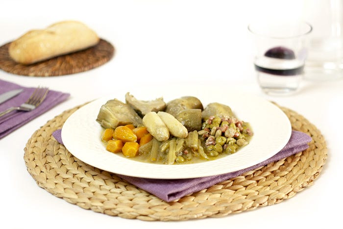 Y tú solo piensas en una cosa: en menestra de verduras, como es natural, más aún si tu madre es navarra y has crecido comiendo esa delicia como si tal cosa. Ese sabor profundo y hortelano que marcan las habas y las alcachofas como directoras de orquesta, y que se encargan de matizar guisantes y espárragos, es una tentación para cualquier chusco de pan que pase por ahí.