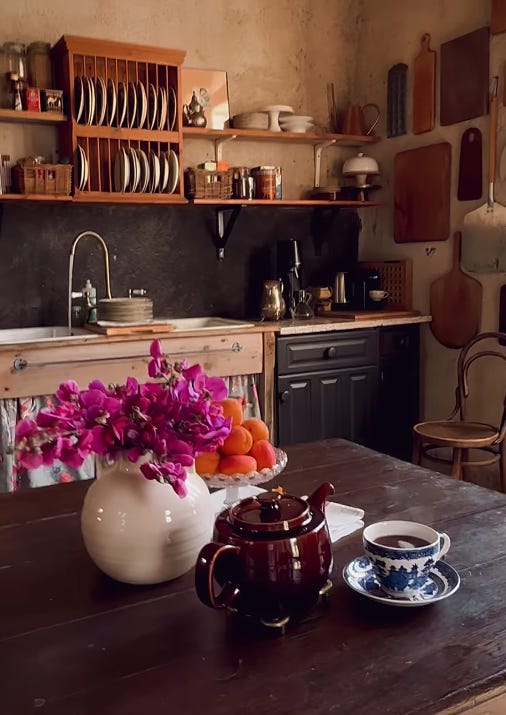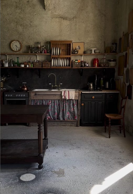 La cocina, del château es un sueño donde hacer surf sobre sus tablas de corte, expuestas en una de las paredes, cerca de la pila. El suelo es virgen, sin revestir. Difícil de limpiar, me dirás. Muy de acuerdo, pero cuánta belleza que admirar cuando no vamos a ser nosotras quienes pasemos la bayeta.