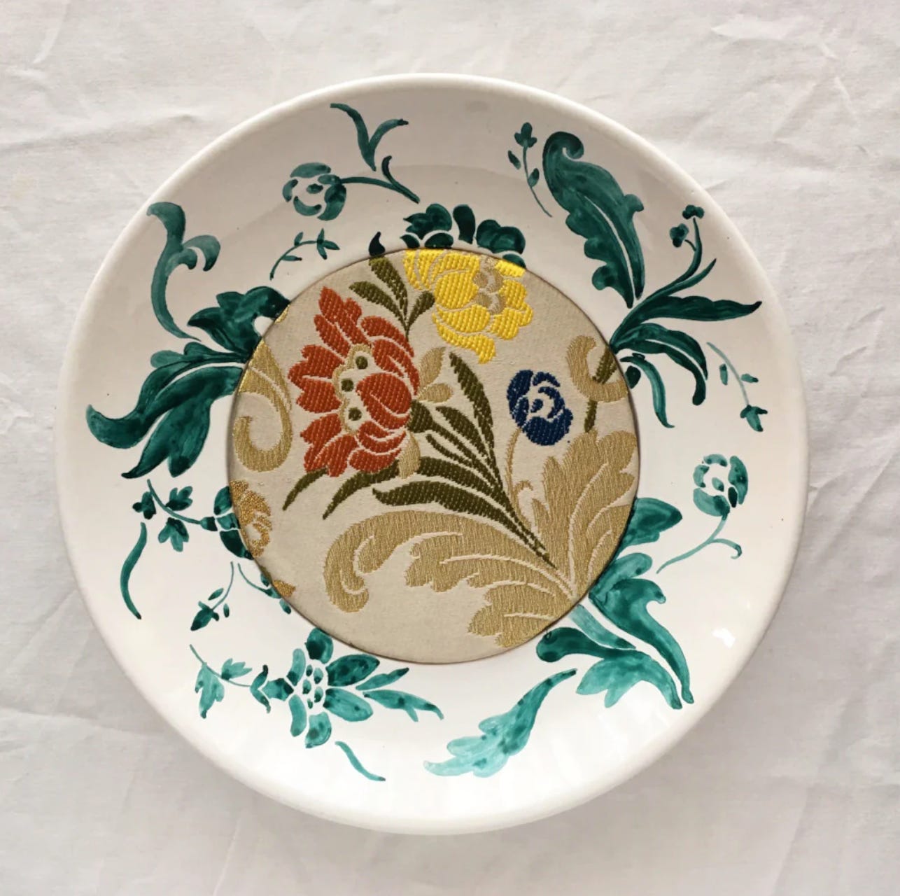 Son platos de cerámica y seda, hechos para disfrutar de su contemplación y no aptos para uso alimentario. La seda se trabaja con la técnica del espolin, un tejido de seda elaborado en Valencia desde el Siglo XVIII y que crece a razón de un centimetro de tela tejido cada día. Una verdadera joya. Su precio: 333 euros cada pieza de 25 cm.