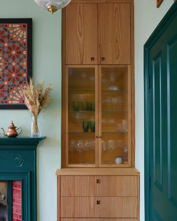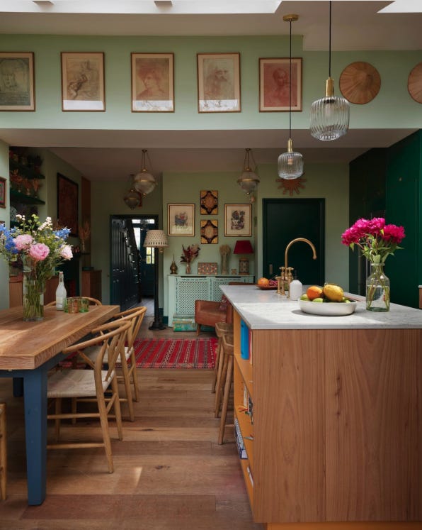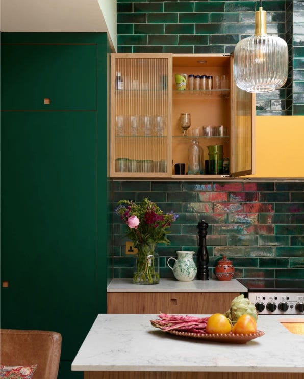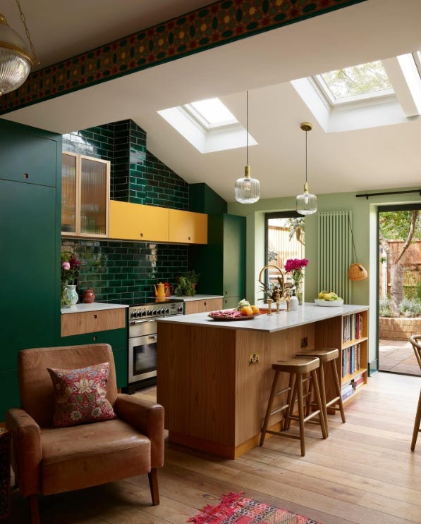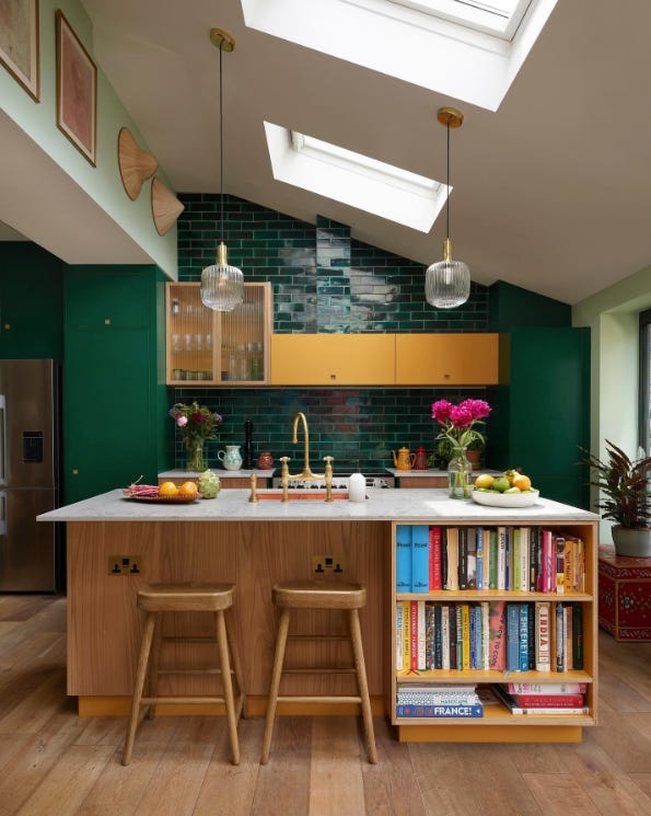 Entre esta ensalada de verdes, vienen el amarillo mostaza y la madera a dar su punto: alegran sin apabullar, y la veta de la madera es tan bonita y elegante que parece dibujada.