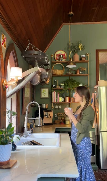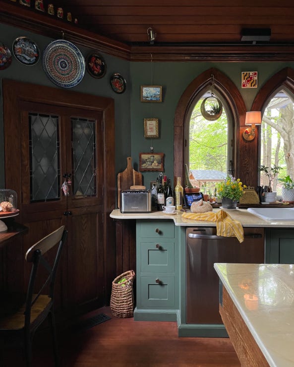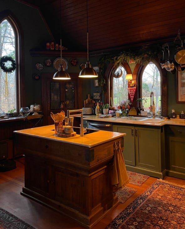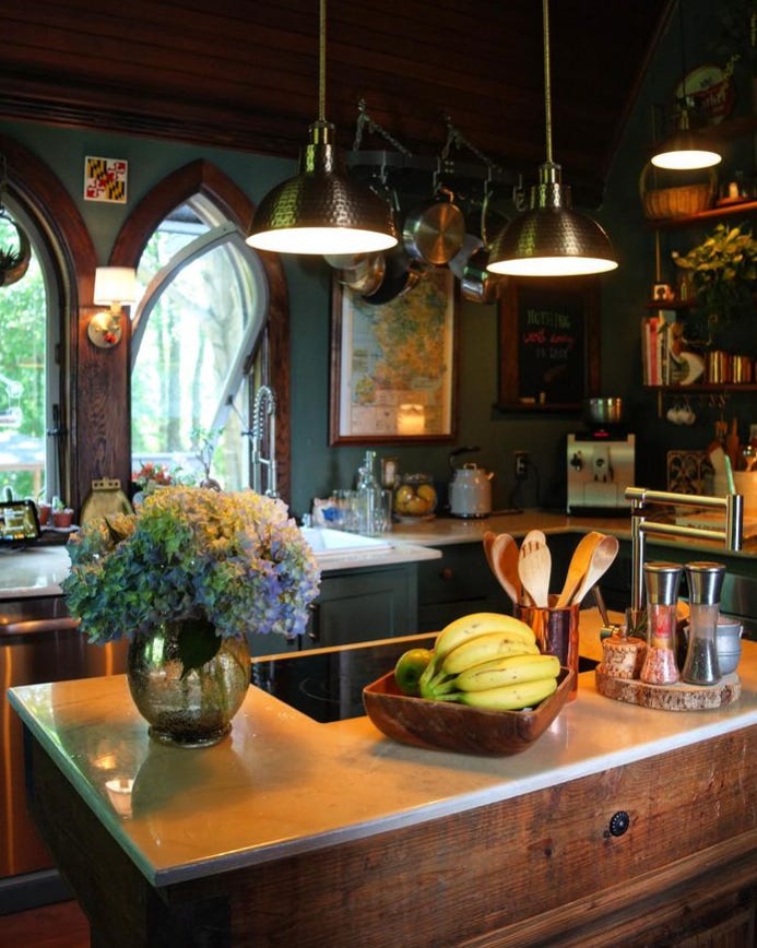 La cocina combina la madera oscura del techo y las ventanas, con un color verde profundo en las paredes y los muebles de cocina. Estos, van rematados por una bonita encimera de mármol blanco que se amplía en la zona húmeda para rodear el enorme fregadero de porcelana.