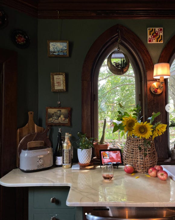 Las ventanas y las molduras de madera que las rodean enseguida nos chivan el origen de esta construcción. En la cocina, las ventanas tienen cristales transparentes, puros y duros, pero en algunas zonas de la casa, como el comedor, las vidrieras se levantan espectaculares entre los muros.