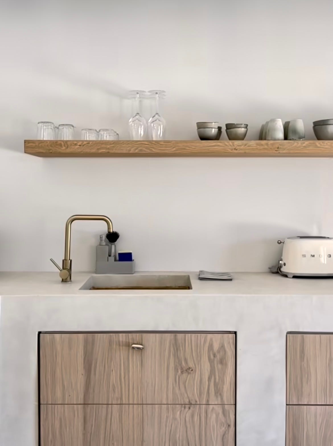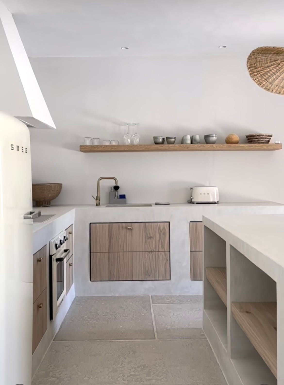 Su cocina es orgánica, simple, minimalista, y también bella y funcional. Aquí el lujo es el espacio y lo derrochan en los grandes muretes entre las puertas de los armarios, en la pared casi vacía atravesada por un único estante, en una isla de obra con baldas de madera para el almacenamiento.