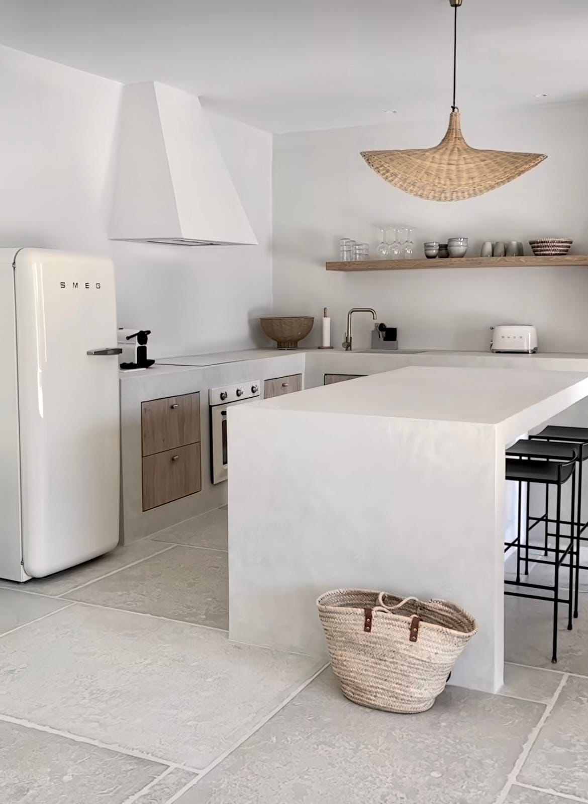 La placa de inducción es blanca también, como el frigorífico Smeg, la campana de obra y el horno encastrado. Mudamos nuestra imaginación por esta semana a esta casa espaciosa y etérea, que trasladar el body ya es otra cuestión.