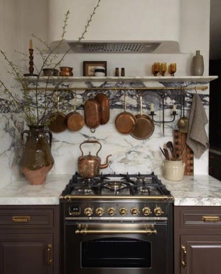 Drew ha disfrutado lo suyo pensando y decorando esta cocina. Algunos elementos están comprados en el mercado de pulgas que tiene cerca de su casa. Sartenes y teteras de cobre; cerámica, farolillos, madera, ramas y cristal, crean un mundo cromático y de texturas muy acertado y sereno.