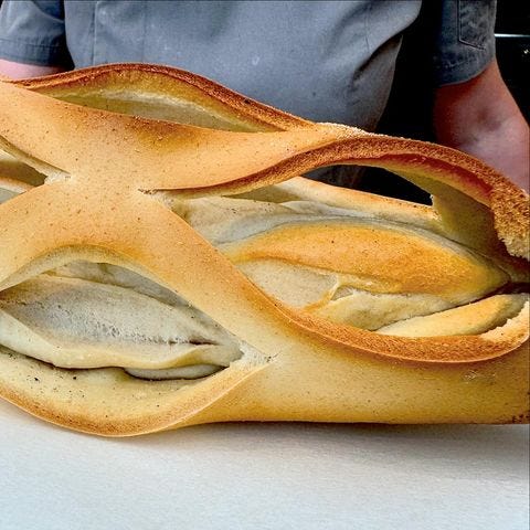 Lo hacen en la panadería Barrihuelo de Elciego (Álava) y consiste en formar una barra, forrarla con una lámina de masa y hacer unos cortes estratégicos para que al cocerse parezca una jaula de pan. Y como para chulos ellos, también hacen colines encamisados.