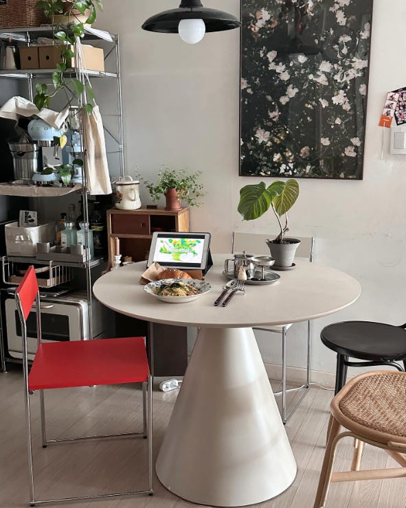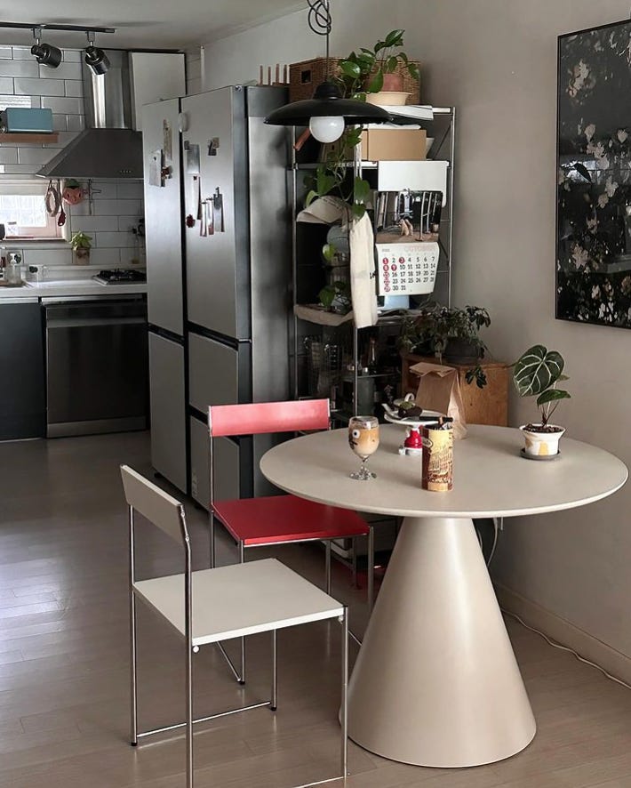 El foco de atención está en la preciosa mesa de cerámica con sobre redondo y soporte cónico. Es de la marca coreana Flat Point. Ahora soñaré con ella sin remedio. Puedes verla en este enlace si a ti también te enloquece.