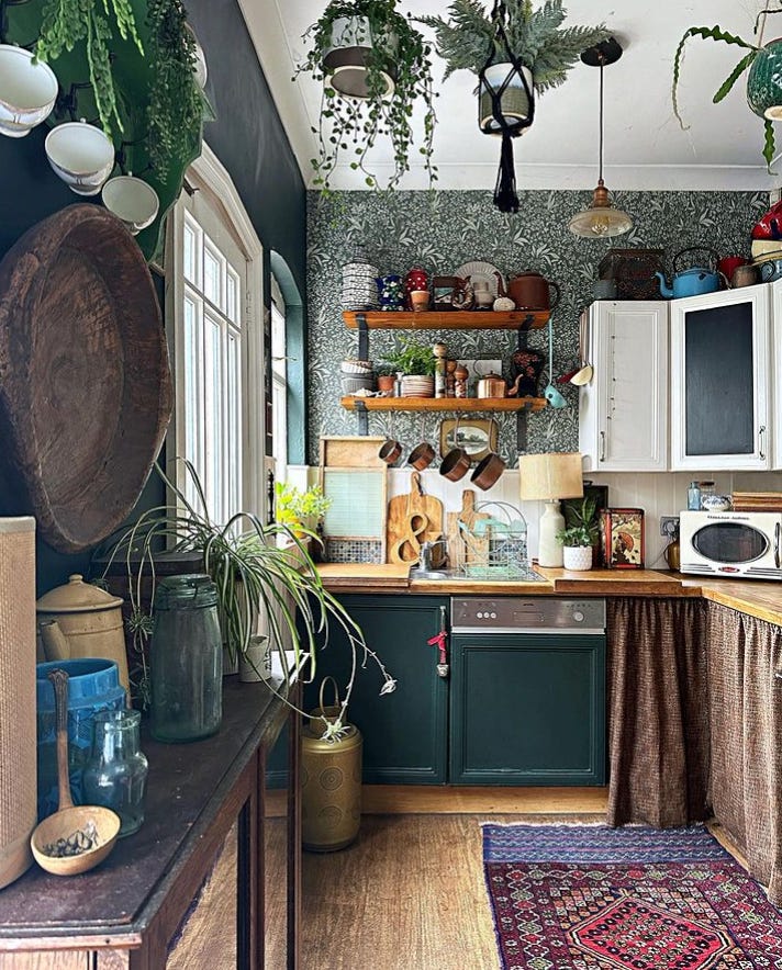 En el techo, en los estantes y en las encimeras aparecen plantas de distintas especies, que le dan un aire muy fresco, como de invernadero. Hay hasta un cuelgamacetas de macramé, mira lo que te digo.
