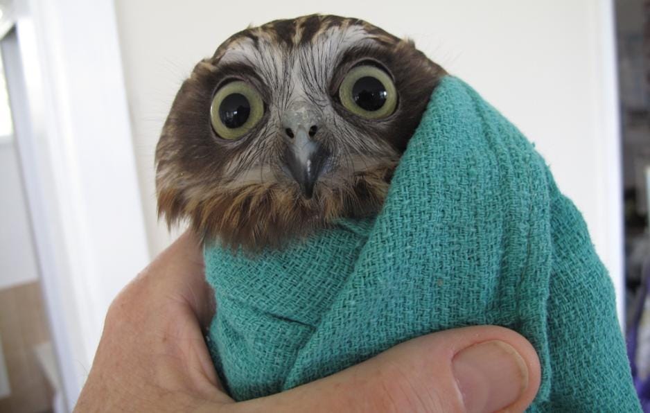 Los búhos, cuando se encuentran en una situación tan vulnerable como un rescate, necesitan sentirse arropados para tranquilizarse y no montar un pollo. Pobrecitos. Quienes les asisten, los envuelven en toallas para calmarlos de inmediato y poder ayudarles.