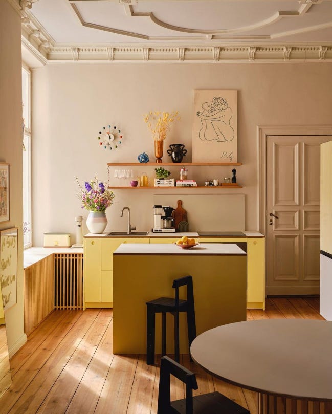 La cocina de Sarah Gottschalk está hecha para ser bañada por el sol de la tarde. El color neutro de la pared refleja y matiza los rayos de sol que entran por el gran ventanal lateral.