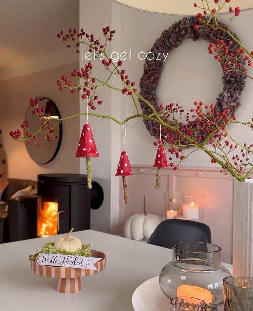 Pero, un momento, no podemos perdernos su salón, con la corona más grande del otoño, calabazas por todos lados y unas setas colgantes hechas con la misma técnica del cartón de huevos.