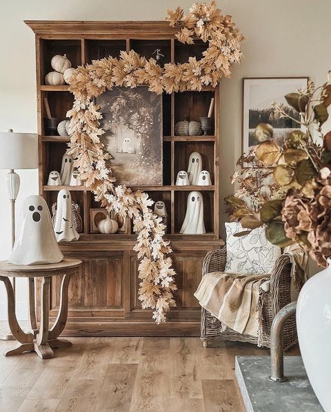 Cuando llega el otoño, rusticwildarrow mete los libros y los Lladrós en cajas y llena la estantería de fantasmas que dan miedo de mentirijillas. Y luego pone una discreta guirnalda de hojas, que le estaba quedando demasiado sencillo y mira, no.