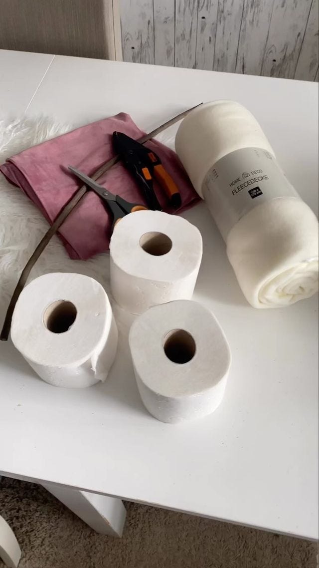 No hace falta que despiporres los cojines de casa para hacer estos sencillos adornos. A anja_und_whoopi los suyos ya le cansaban y decidió darles nueva vida, pero unos retales te harán el mismo apaño. No hay ni que coser, y cuando haya que hacer sitio al espumillón, se devuelven los rollos al baño y aquí no ha pasado nada.