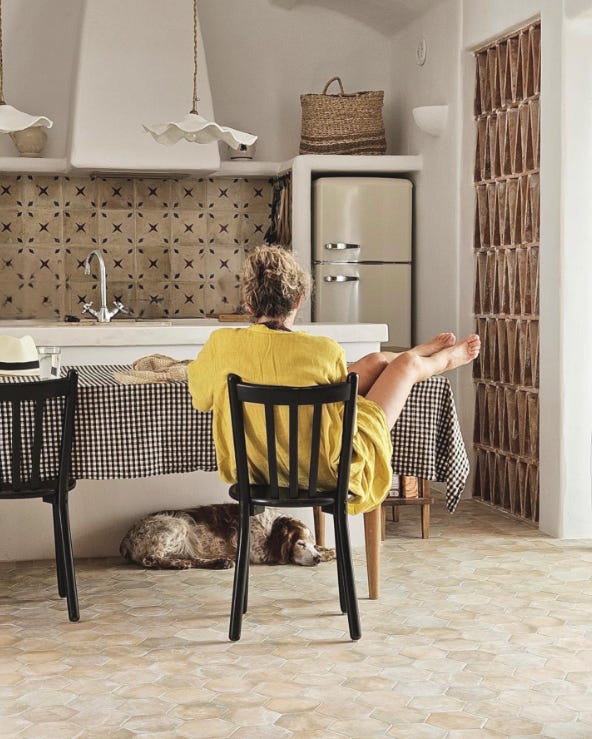 Empiezo mirando al suelo. Las baldosas hexagonales de barro cocido me parecen preciosas y muy adecuadas. Me da en la nariz que aquí ha habido un largo viaje para encontrarlas, porque esta cerámica normalmente se sirve en tonos rojizos. Es una base perfecta sobre la que desarrollar este espacio tan delicado.