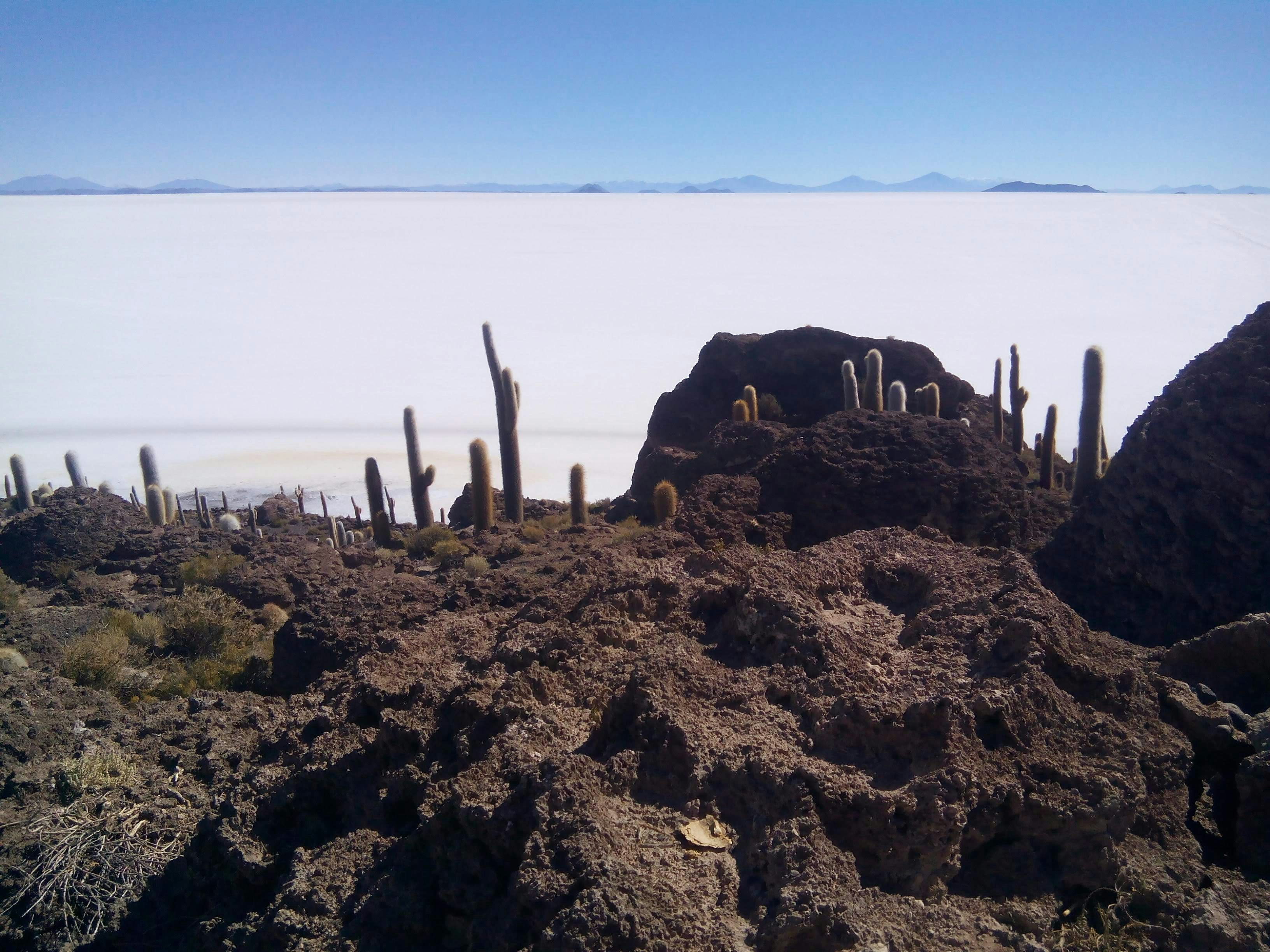 La isla Incahuasi o isla del pescado es un montículo de tierra plagado de cactus milenarios –Echinopsis atacamensis o cardón–, algunos de hasta 10 metros de altura. La isla es un contraste en mitad del inmenso desierto de sal.
